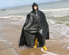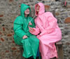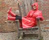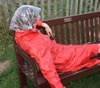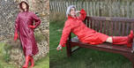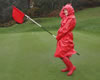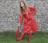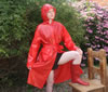 in a bright red hooded Rukka style mac with red boots and wellies.